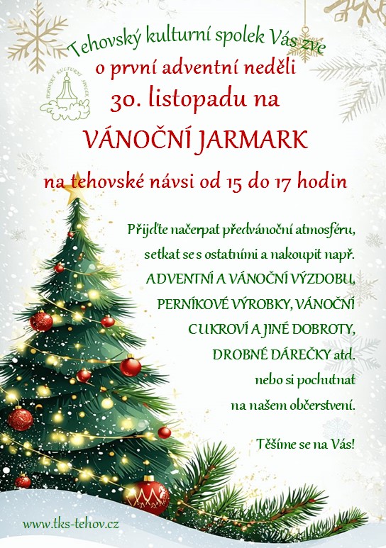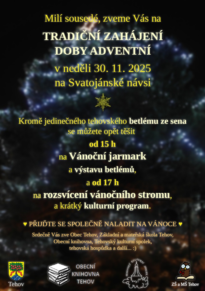 Všichni jste srdečně zváni na tradiční sousedské setkání při příležitosti Rozsvícení vánočního stromu o první adventní neděli 30. 11. v 17h na Svatojánské návsi, kterému bude předcházet Vánoční jarmark (15-17hod) a Výstava betlémů v témže čase. Výstava tak doplní tehovský betlém ze sena, který bude jeho autorka, paní Ivanka Šotkovská, instalovat postupně pod naši návesní borovici již od soboty a i letos ho budete moci při Vašich procházkách obdivovat až do Tří králů.