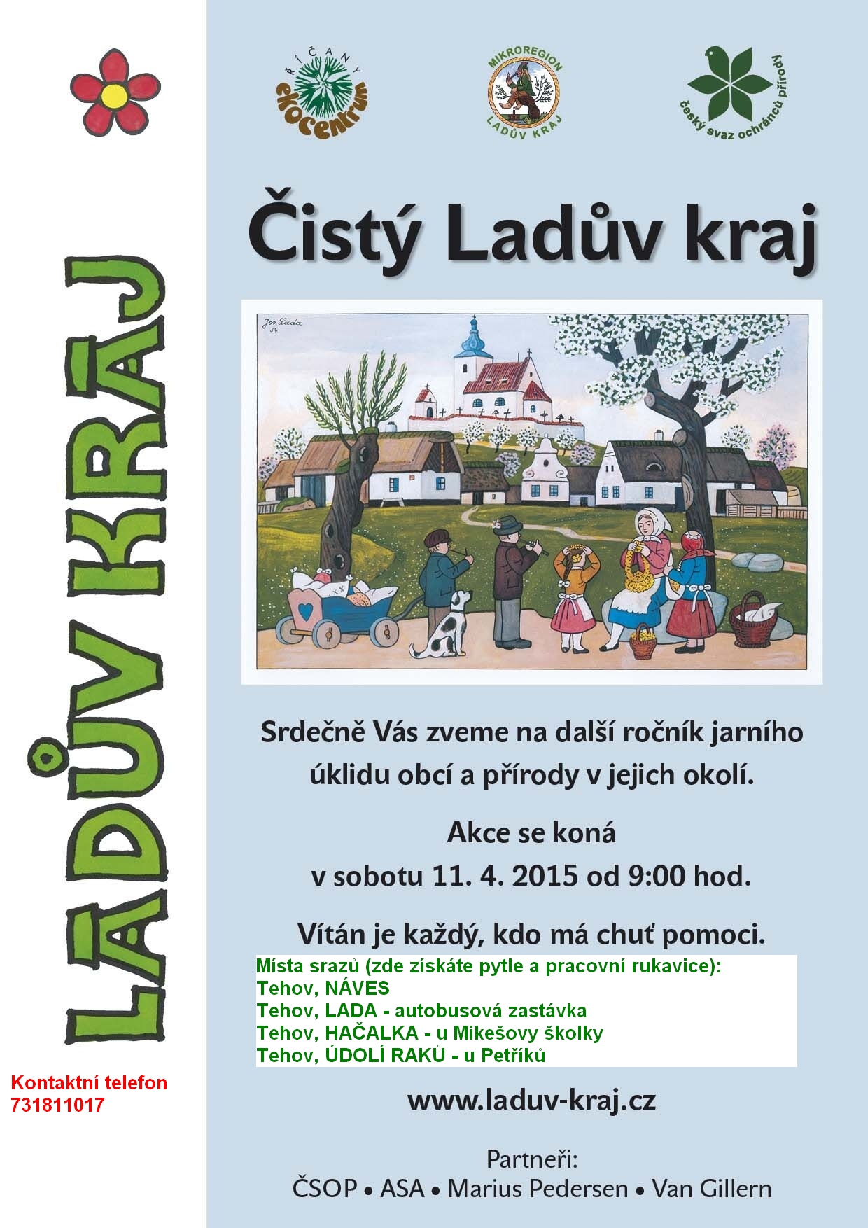 Brigáda na úklid obce a jejího okolí proběhne již tuto sobotu od 9h, aktivní občané Tehova se do této akce Ladova kraje zapojí letos již čtvrtým rokem. Místa srazů: Tehov - náves, Lada – autobusová zastávka, Údolí Raků – u Petříků a Tehov Hačalka – u MŠ. Zde obdržíte pytle a pracovní rukavice. Přijďte i s dětmi, ukažme jim, že na životním prostředí záleží. Plakát zde.