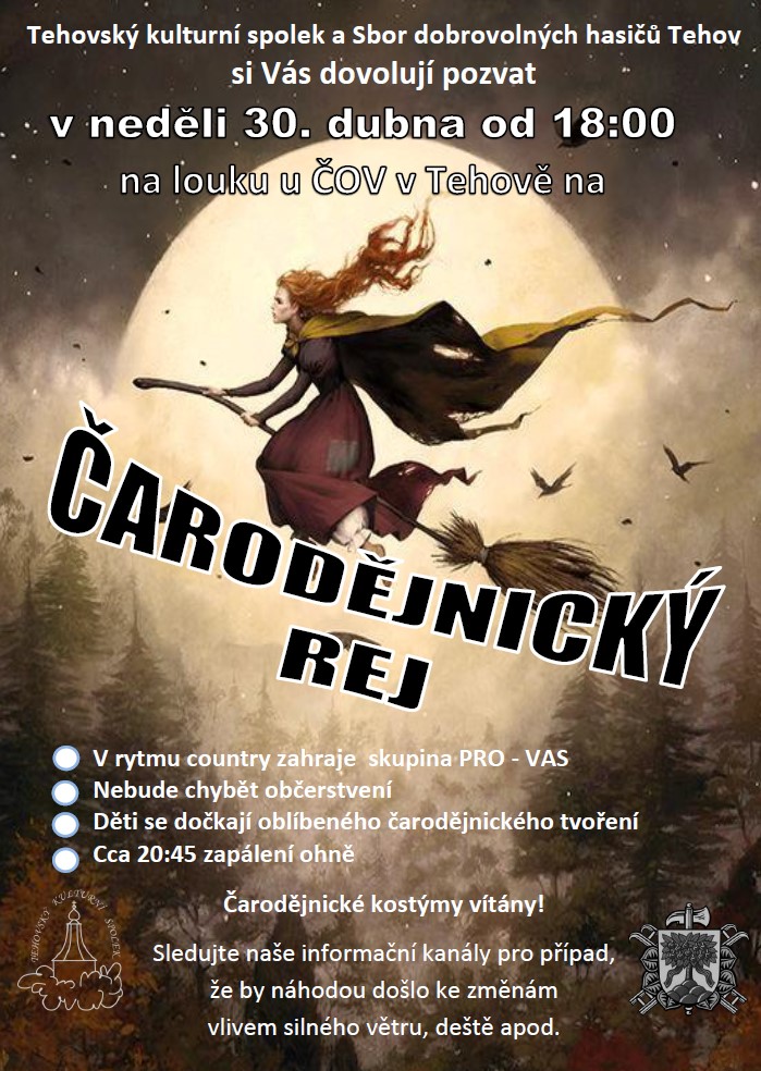 Tehovský kulturní spolek a tehovští hasiči zvou všechny v neděli 30.4. od 18 hodin na louku u ČOV na Čarodějnický rej.