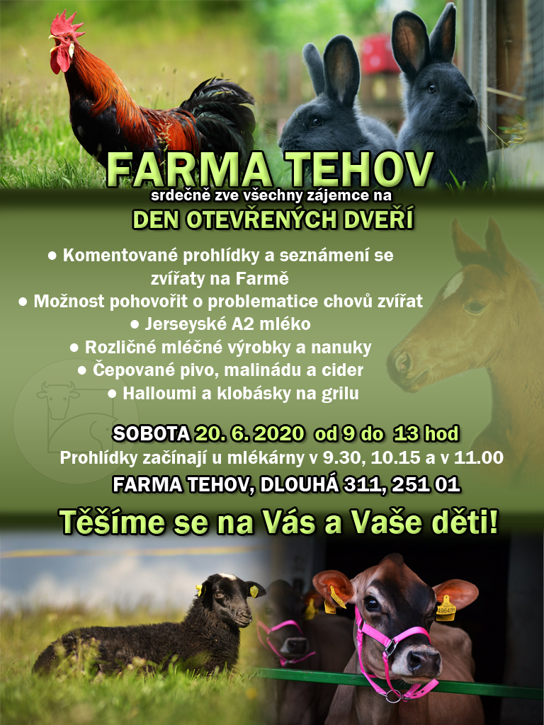 20. června 2020 pro vás a vaše děti chystáme Den otevřených dveří, resp. vrat od chlíva na Farmě v Tehově. :-) Přijďte podrbat zvířata, pohovořit, nakoupit, popít. Snad nás počasí nezklame!