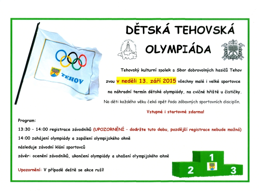 Jste srdečně zváni na Tehovskou Olympiádu dne 13. 9. 2015 na cvičné hřiště u čističky.