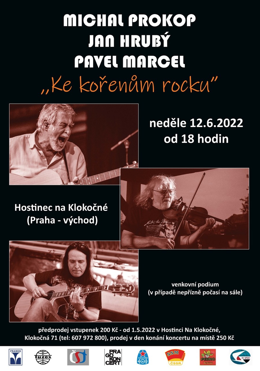 Michal Prokop, Jan Hrubý a Pavel Marcel vystoupí na koncertě „Ke kořenům rocku“ v neděli 12. června od 18:00 na venkovním podiu před Hostincem na Klokočné.