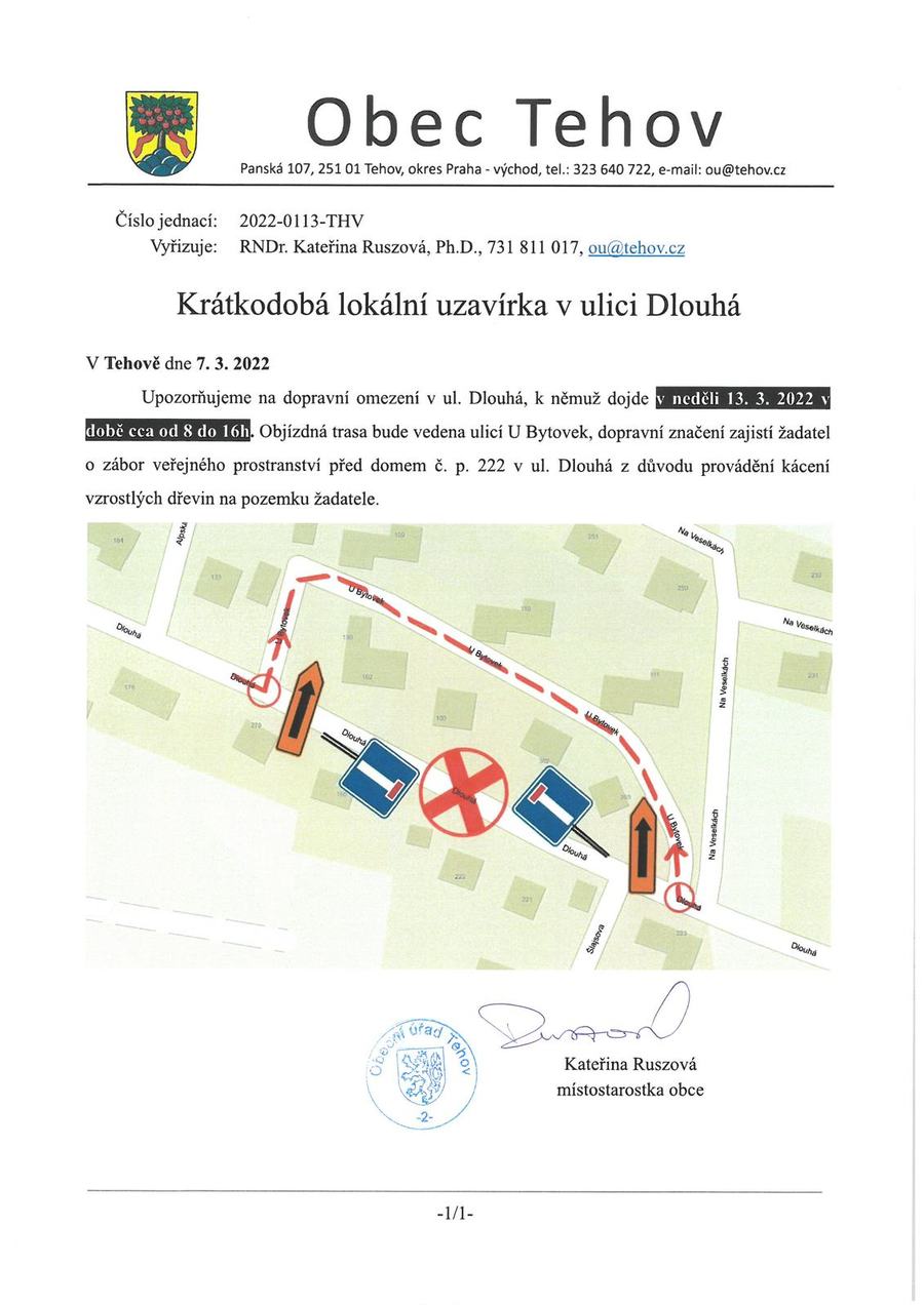 Upozorňujeme na dopravní omezení v ul. Dlouhá, k němuž dojde v neděli 13. 3. 2022 v době cca od 8 do 16h. Objízdná trasa bude vedena ulicí U Bytovek, dopravní značení zajistí žadatel o zábor veřejného prostranství před domem č. p. 222 v ul. Dlouhá z důvodu provádění kácení vzrostlých dřevin na vlastním pozemku.