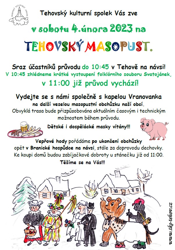Tehovský kulturní spolek zve všechny v sobotu 4. února na další masopust v Tehově. Sraz účastníků do 10:45h na tehovské návsi, následuje krátké vystoupení dětského souboru Svatojánek a v již 11:00 průvod vyráží. Vydejte se společně s kapelou Vranovanka na další veselou masopustní obchůzku naší obcí. Nebudou chybět ani masopustní dobroty. Dětské i dospělácké masky vítány!