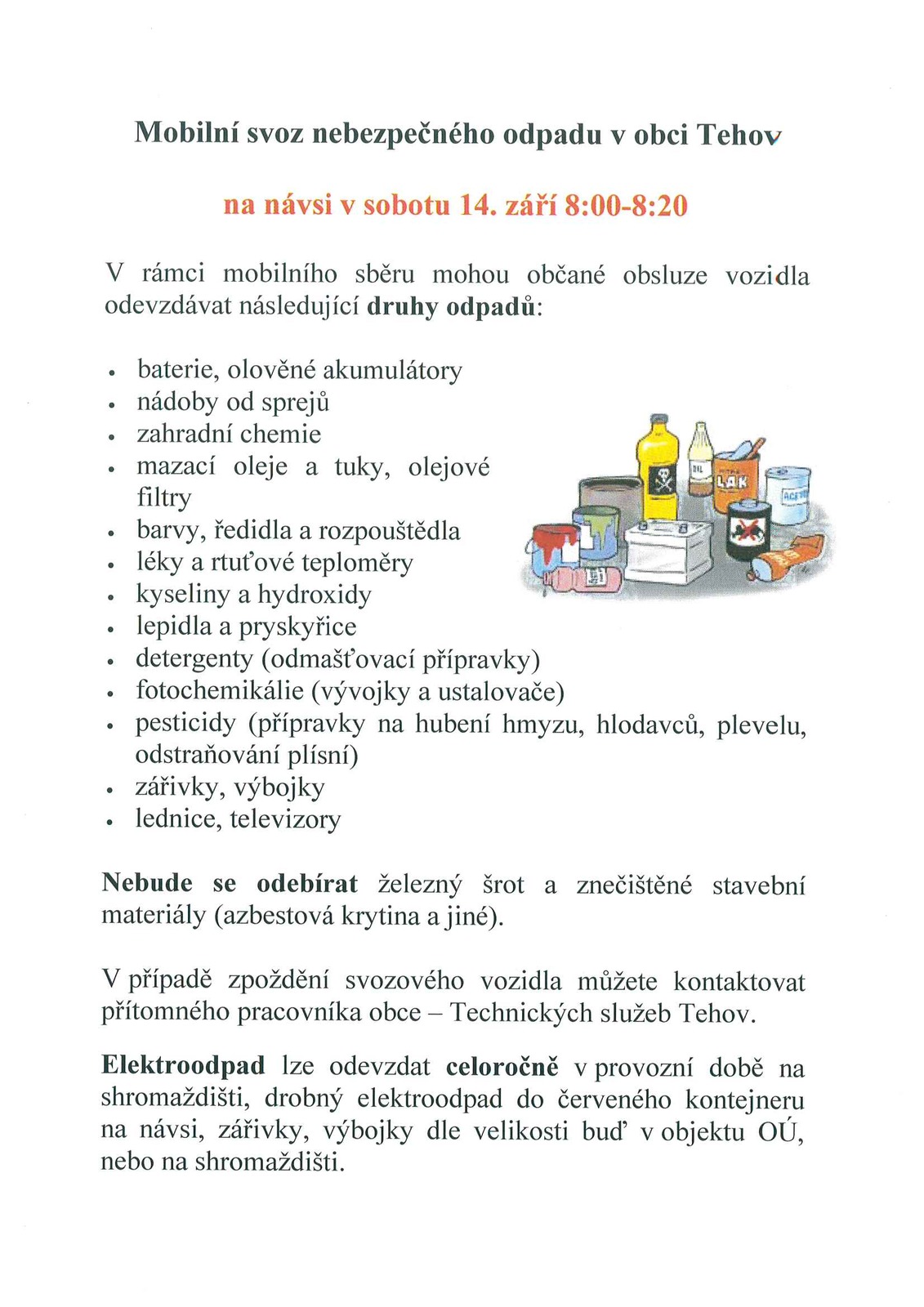 Obecní úřad Tehov informuje o podzimním termínu mobilního svozu nebezpečných odpadů: