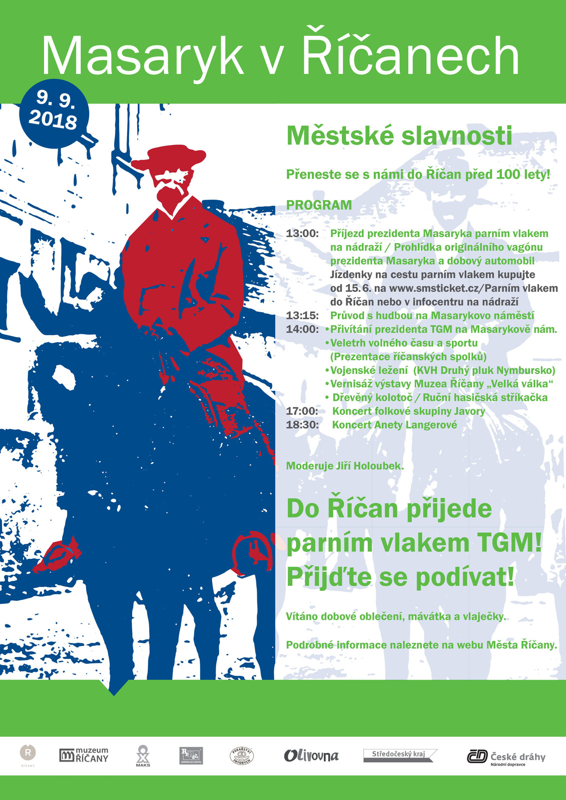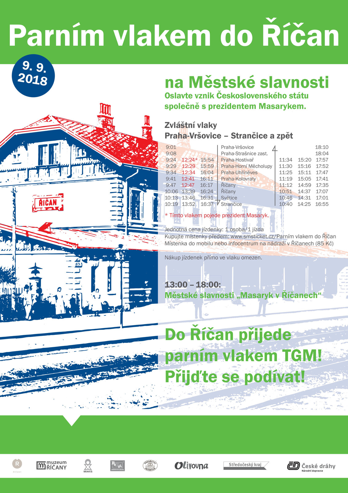 Město Říčany připravuje na neděli 9. září několik jízd historického parního vlaku na trati Praha Hostivař – Říčany – Strančice. V jedné z jízd pojede i pan prezident TGM, který v Říčanech vystoupí. Občané Říčan a okolí ho náležitě a se všemi poctami přivítají, vítaní jsou všichni, kdo přijdou v prvorepublikovém oblečení. Poté bude následovat průvod v čele s prezidentem na Masarykovo náměstí. V průvodu budou zástupci říčanských spolků a organizací a budou vítáni občané i zástupci spolků ze všech okolních obcí, hasiči, sokolové, baráčníci a nejen ti, aby se do oslav a průvodu zapojili. Na náměstí bude s TGM pokračovat další zajímavý program.
