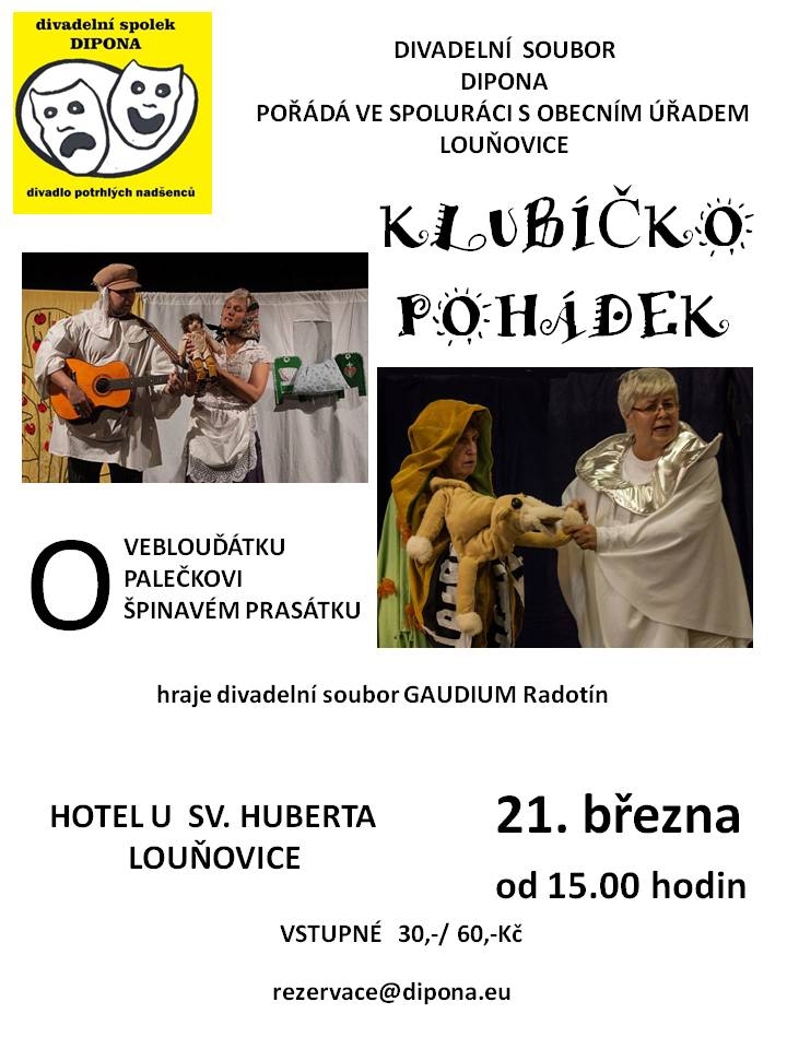 Přijměte pozvání na dvě divadelní představení pro děti v sále hotelu U Sv. Huberta v Louňovicích.