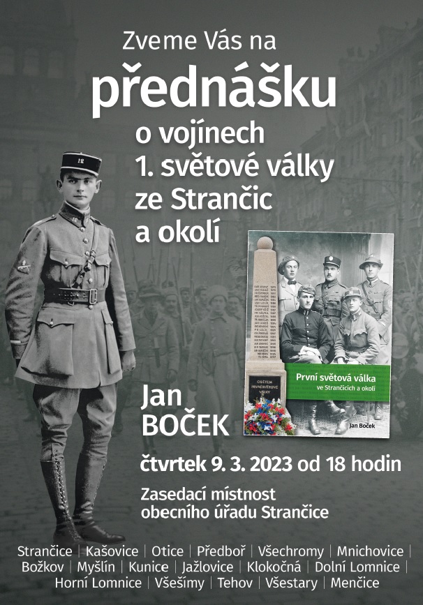 Pozvánka na přednášku 9. 3. do Strančic - o vojínech 1.sv války