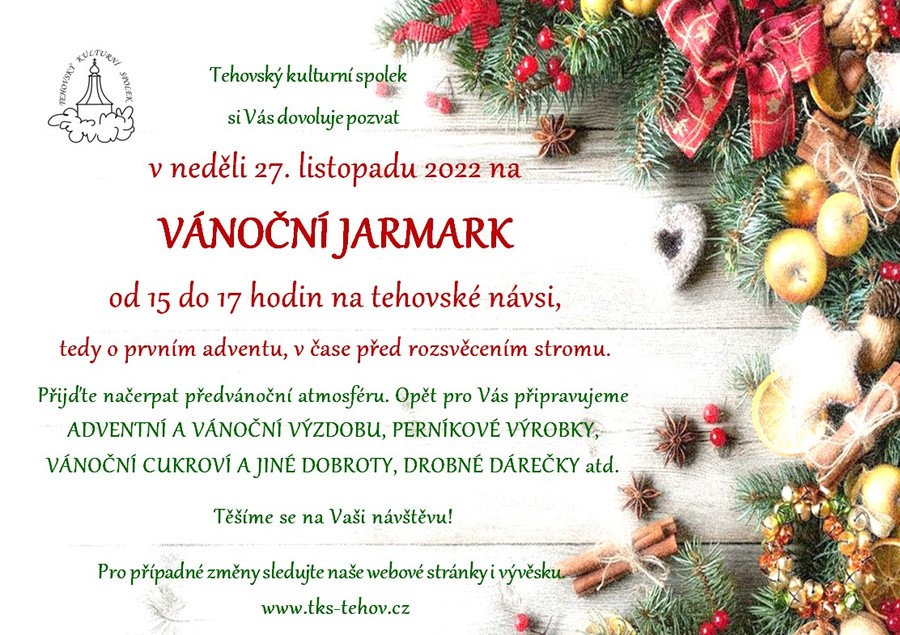 - 15-17h Vánoční jarmark - ke koupi bude adventní a vánoční výzdoba, perníkové výrobky, vánoční cukroví a jiné dobroty, dárečky apod. Nebude chybět ani drobné občerstvení. Srdečně zve Tehovský kulturní spolek.