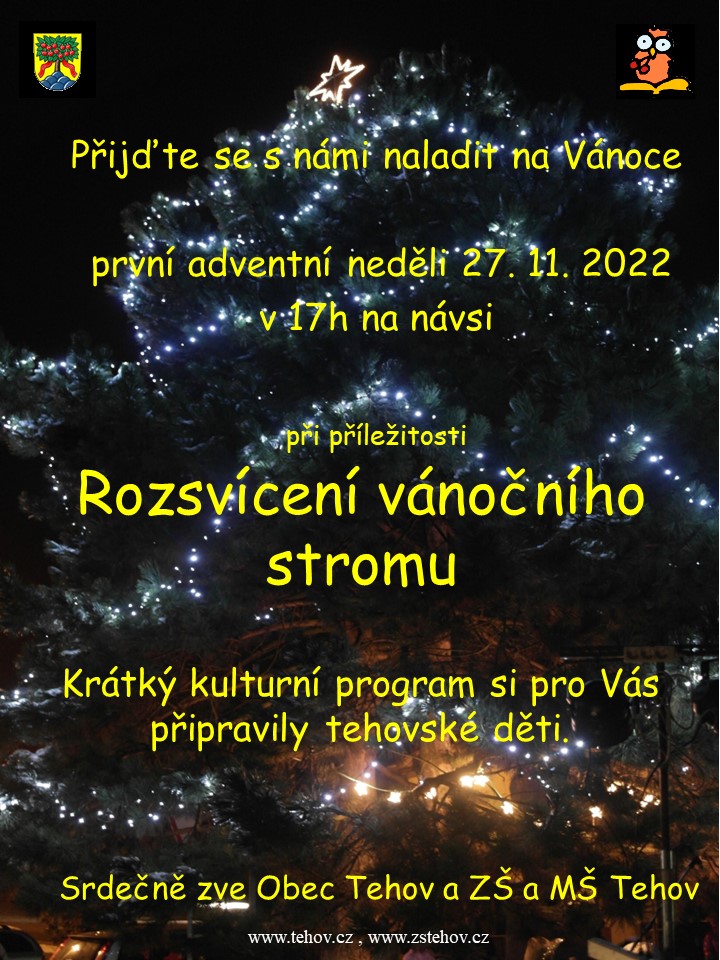 - 17h Rozsvícení vánočního stromu na návsi - krátký adventní program si pro Vás připravily tehovské děti. Srdečně zve Obec Tehov a ZŠ a MŠ Tehov.