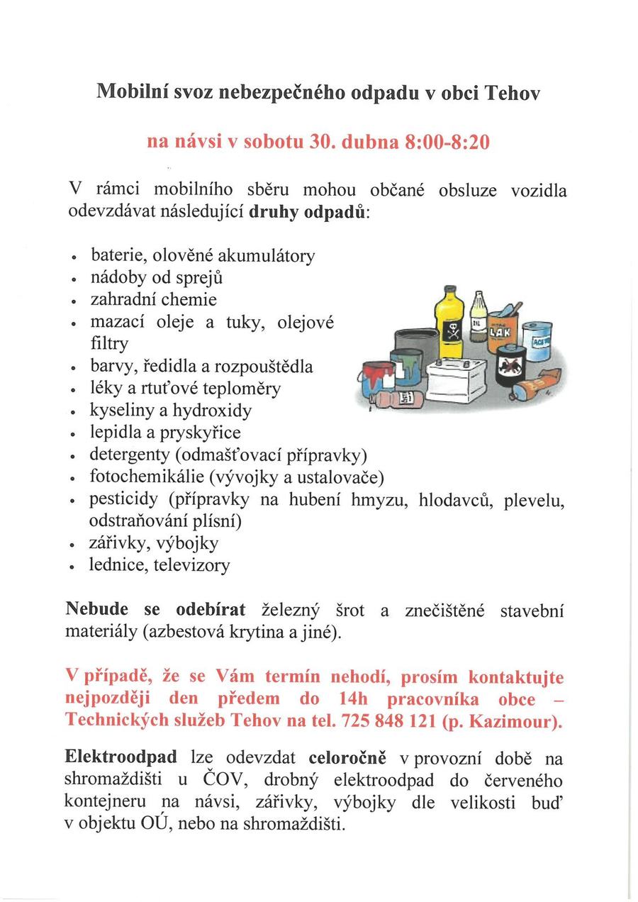 Svoz nebezpečného odpadu SO 30.4. 8-8:20 náves obce