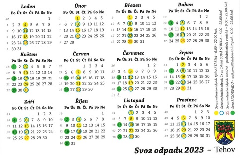 UPOZORNĚNÍ: SVOZ směsného odpadu s frekvencí 1x za 14 dní probíhá celoročně v sudé týdny - omlouváme se za chybu tisku v části distribuovaných kalendářů svozu - v KVĚTNU svoz probíhá std. sudé týdny 18., 20. a 22. týden (3.5., 17.5. a 31.5.)! Zde je správná verze kalendáříku.