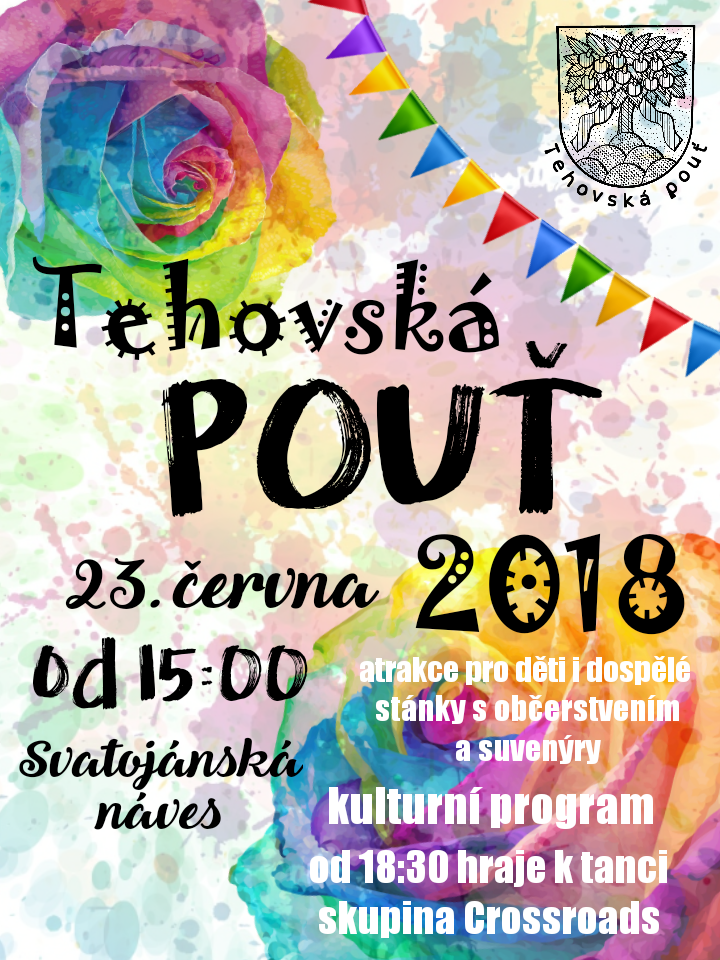 Kulturní výbor obce Tehov ve spolupráci s místními spolky zve všechny v sobotu 23. června od 15h na náves, kde se v rámci TEHOVSKÉ POUTI můžete těšit na drobné atrakce pro děti (i větší děti :) a tradiční pouťové suvenýry a občerstvení. V rámci kulturního programu vystoupí děti z MŠ a ZŠ Tehov, v podvečer kolem 18:30 muziku pod širým nebem zajistí kapela Crossroads.