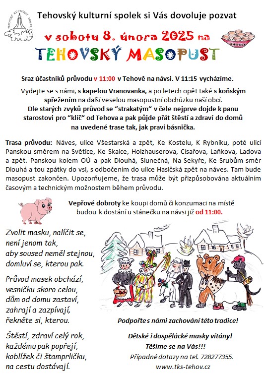 Tehovský kulturní spolek zve všechny na TEHOVSKÝ MASOPUST, který pořádá v sobotu 8. února. Vydejte se s námi, s kapelou Vranovanka, a po letech opět také s koňským spřežením na další veselou masopustní obchůzku naší obcí. Dle starých zvyků průvod se “strakatým“ v čele nejprve dojde k panu starostovi pro “klíč“ od Tehova a pak půjde přát štěstí a zdraví do domů na uvedené trase tak, jak praví básnička. Trasa, básnička i podrobnosti na přiložené pozvánce.