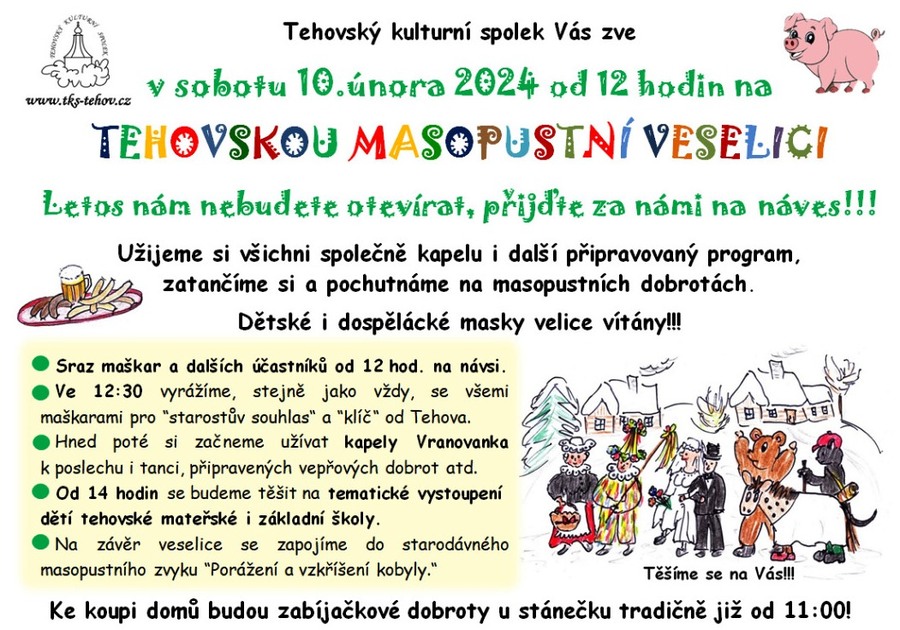 Tehovský kulturní spolek si Vás dovoluje pozvat v sobotu 10. února od 12 hodin na náves na masopustní veselici.