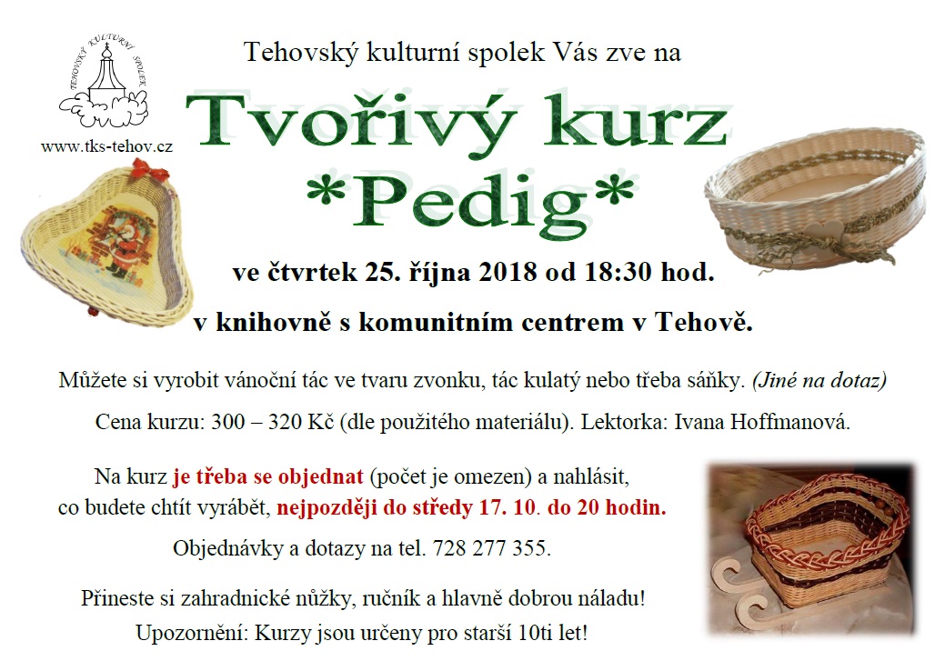 Tehovský kulturní spolek Vás zve na Tvořivý kurz - Pedig, který se bude konat ve čtvrtek 25. 10. od 18:30 v tehovské knihovně s komunitním centrem. Na kurz je nutné se přihlásit nejpozději do středy 17. 10. do 20 hodin, aby bylo možné objednat materiál na Vámi vybraný budoucí výrobek. Můžete si vyrobit vánoční tác ve tvaru zvonku, tác kulatý nebo třeba vánoční sáňky. Ostatní na dotaz. Objednávky a dotazy směřujte na tel. 728 277 355.