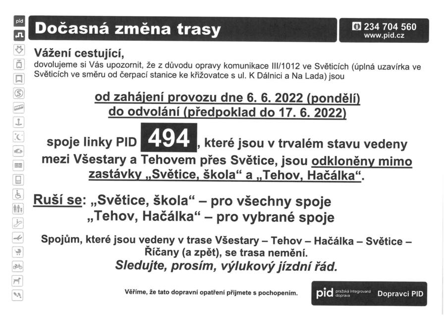 Týká se spojů linky PID 494, které jsou v trvalém stavu vedeny v trase Všestary – (Světice, škola) – Tehov, Hačálka – Tehov - …