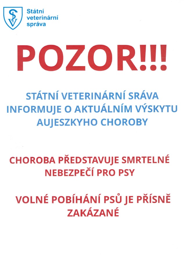Upozorňujeme zejména pejskaře na výskyt Aujeszkyho choroby v katastru obce Tehov. U psů způsobuje nervové příznaky podobné vzteklině a intenzivní svědění, přičemž končí vždy úhynem do 1–2 dnů od příznaků. V ČR se vyskytuje u divokých prasat (až 21 % pozitivních), prevencí je zamezení kontaktu psů s divočáky a tepelná úprava masa.Přirozeným hostitelem viru Aujeszkyho choroby a jediným druhem, který přežívá infekci, je prase. Virem Aujeszkyho choroby se mohou nakazit téměř všechny druhy savců kromě člověka a primátů. Onemocnění u všech druhů, kromě prasat, končí vždy úhynem.